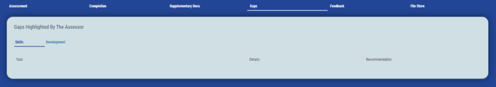 Next is the gaps page, this will show you any gaps in either skills or development by clicking the relevant option. With this info the delegate can go back and re do any competencies that the assessor has marked as a gap.