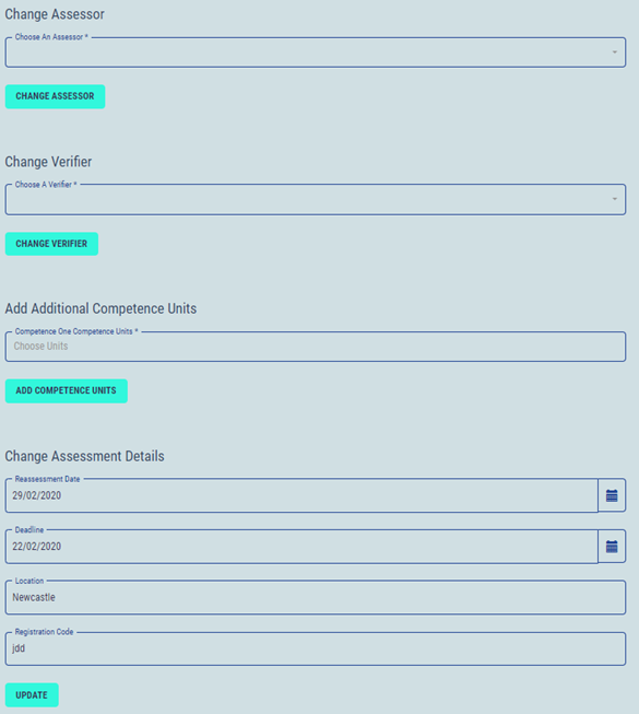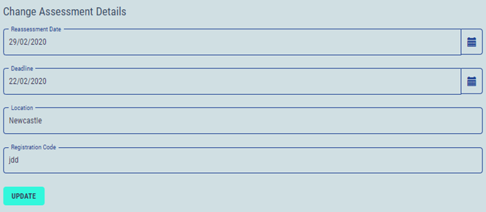 To change any of the reassessment dates, deadlines, location or registration codes you can do this by clicking in the relevant boxes below and editing them, then select the ‘Update’ button.