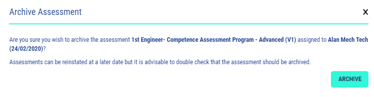 You will be prompt with a message to confirm you are sure to archive this assessment, once you click Archive this will then move this assessment to the Archived tab on the Assessment page.