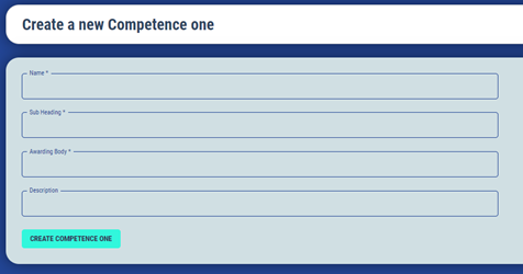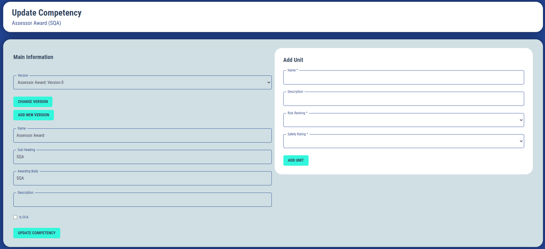Add competence units by filling in the Name, Description, Risk Ranking and Safety Ranking