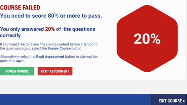 If you do not achieve the required score to pass the module, the course will give you a ‘Course Failed’ screen and the % you scored.