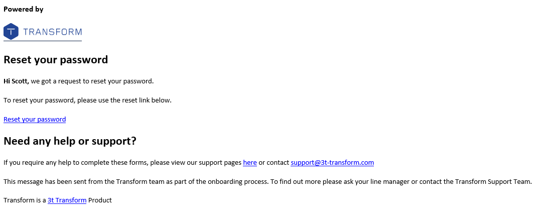 Select the ‘Reset your password’ link on the email you have received from the Transform LMS.