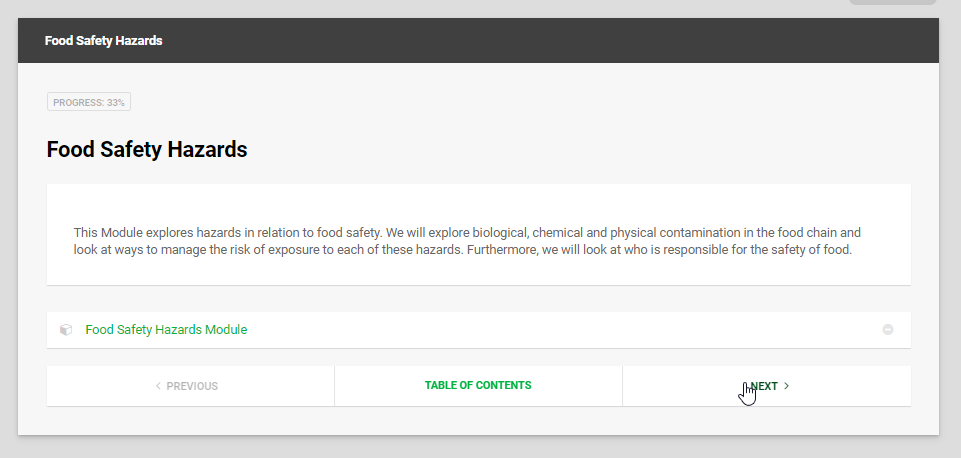 Once you have started the course it will load on the current window you are using. Depending on the course you have been assigned it will display either ‘Start’ ‘Next’ or ‘Begin’ to get the course going.