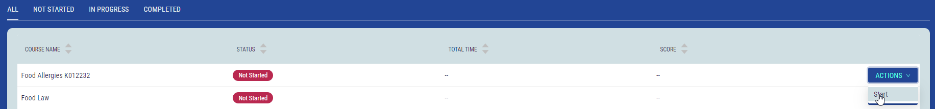 To start a new course assigned to you, you can select on ‘Actions’ then “Start”