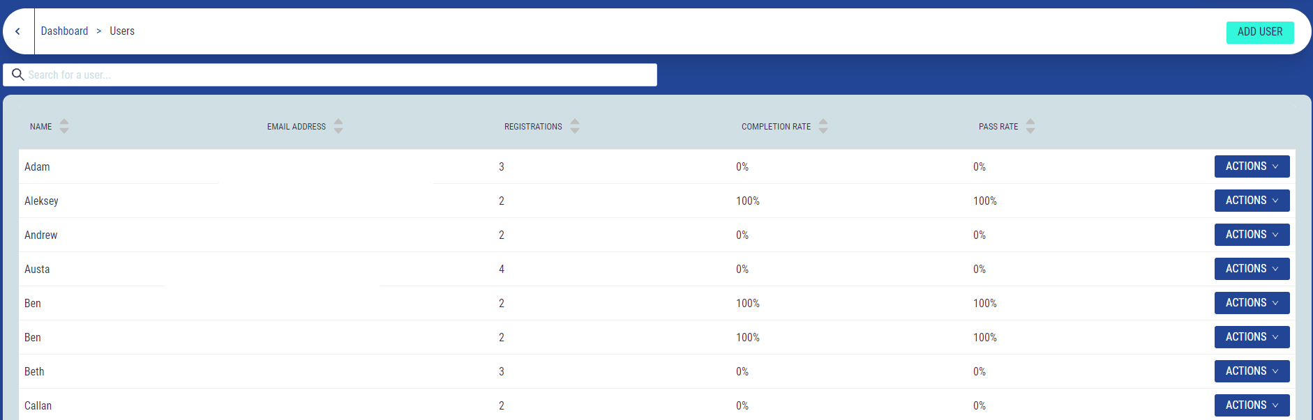 Actions | Action button gives you the option to Add a Use, Assign a Course, Assign a Category & Send Course Reminders |