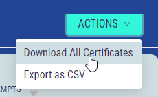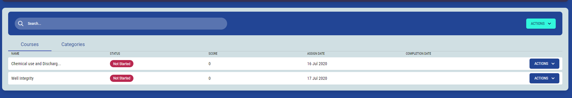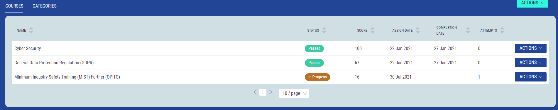 Actions | Gives you the option to download the users certificates for courses they have passed and also download export their assigned courses as a CSV file. |