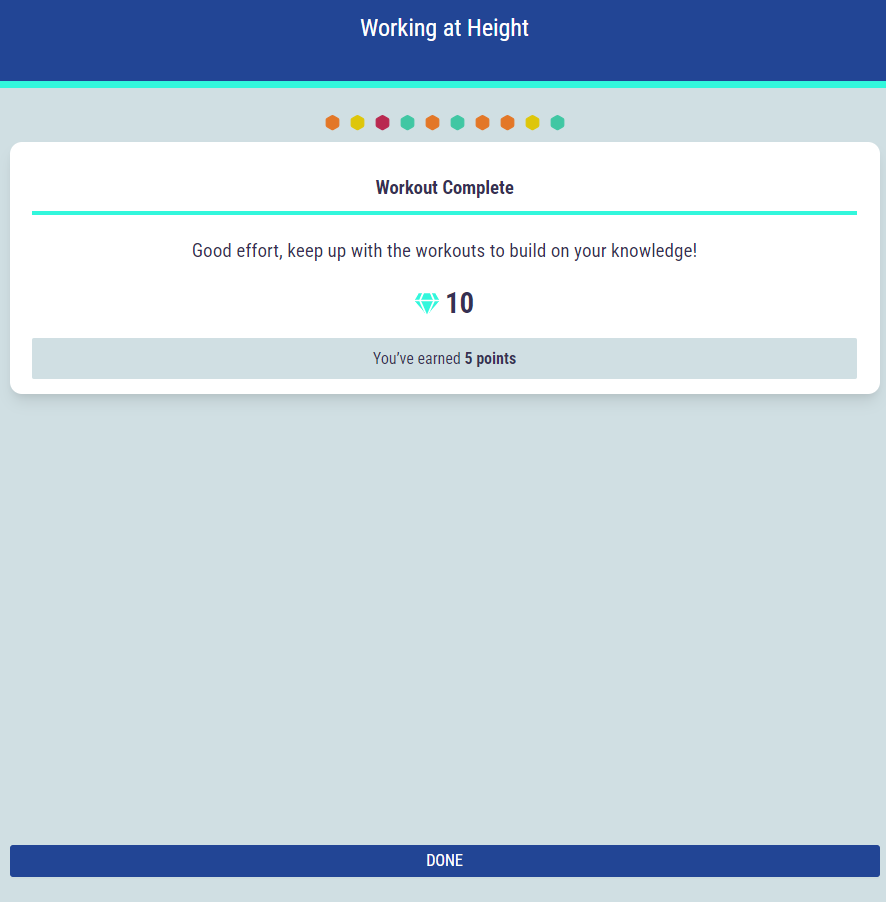 Upon completing all the answers for the assigned R3 Learning content, you'll encounter a "Workout Complete" notification, similar to the one shown below. Additionally, you'll have visibility into the points earned from this workout.