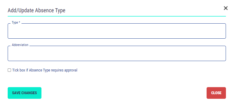 To add a Absence Type select the ‘Add ’ button, complete the fields in the ‘Add Absence Type' form and select ‘Save Changes’ to create. Your Absence Type will now appear within the list.