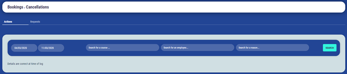 To refine the list, you can filter by date, course name, employee, and cancellation reason using the fields displayed below. Simply select the search button after entering your criteria.