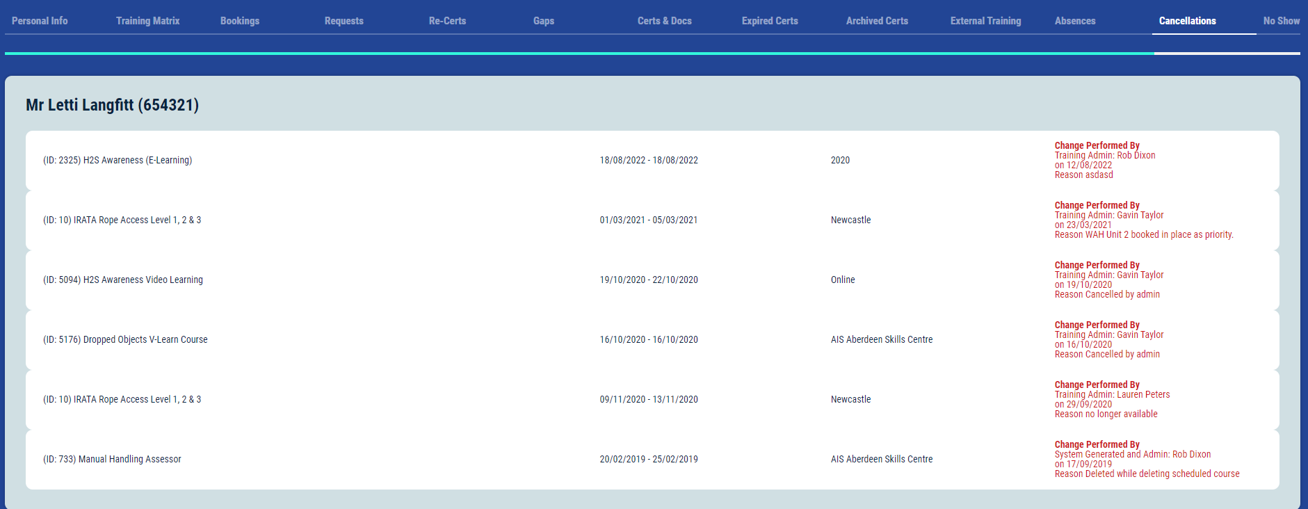 This section will show all bookings that have been cancelled from the “Bookings Tab”, once a booking has been cancelled you are no longer able to re-instate this booking