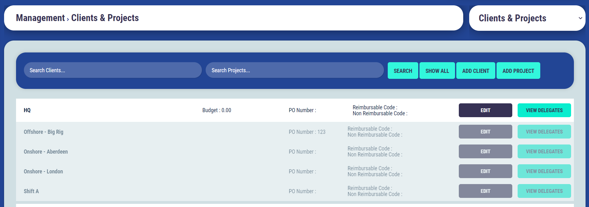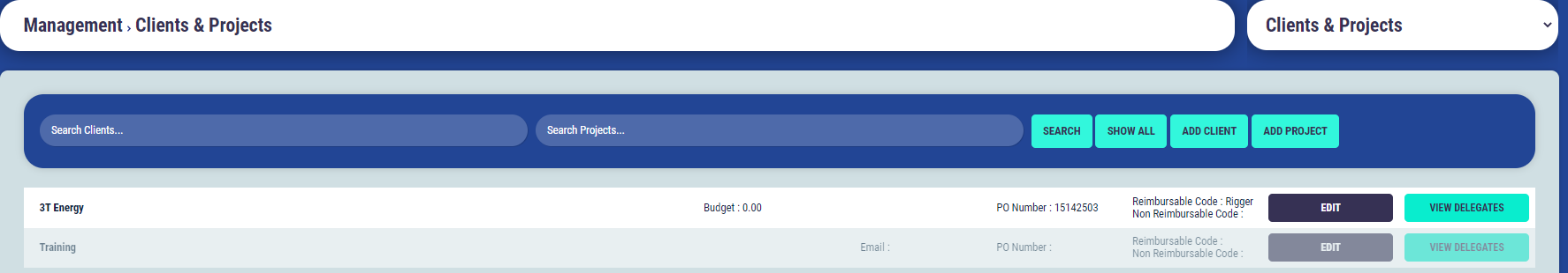 If you click on the “View Delegates” button next to the Client or Project you will be taken to the delegate search page and this will only show you the list of delegates that have been assigned to that Client or Project