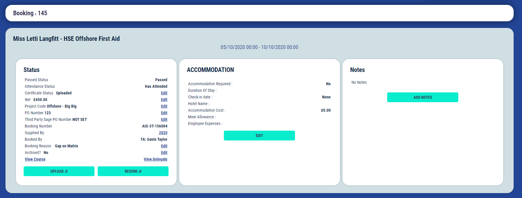 Passed  | Booking status has been updated to Passed, this is usually updated once it is confirmed the delegate has Passed the training course associated with the booking.  |