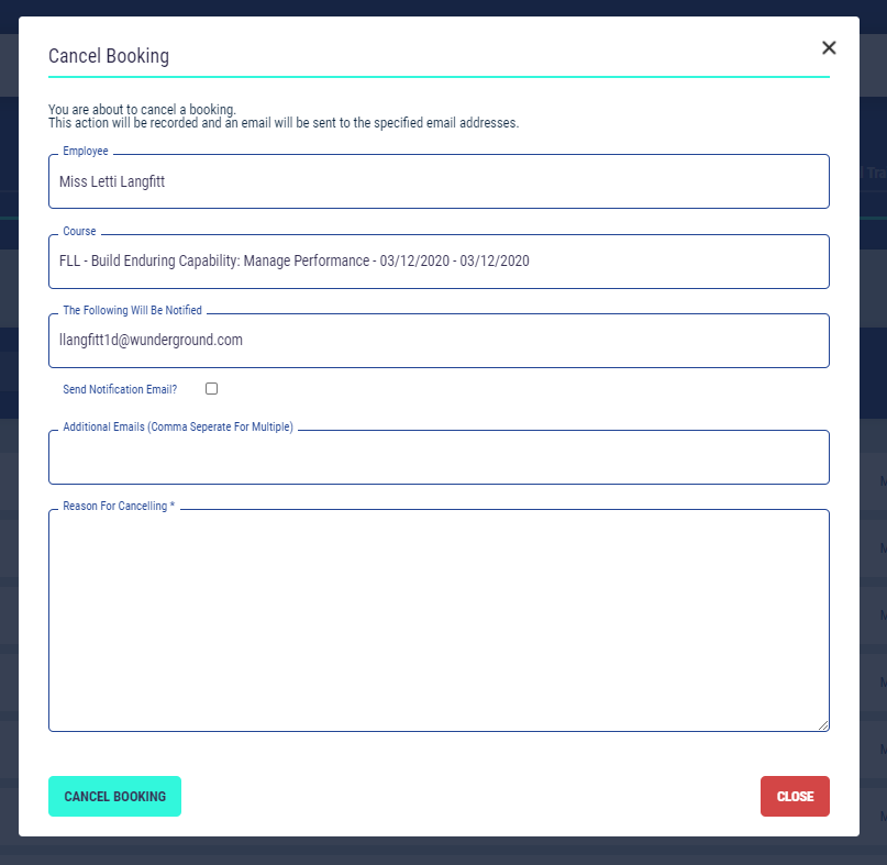 Selecting “Cancel” from the “Actions” button will allow you to cancel the course. You will be asked to complete the ‘Cancel Booking’ from, select ‘Cancel Bookings’ to confirm the cancellation.