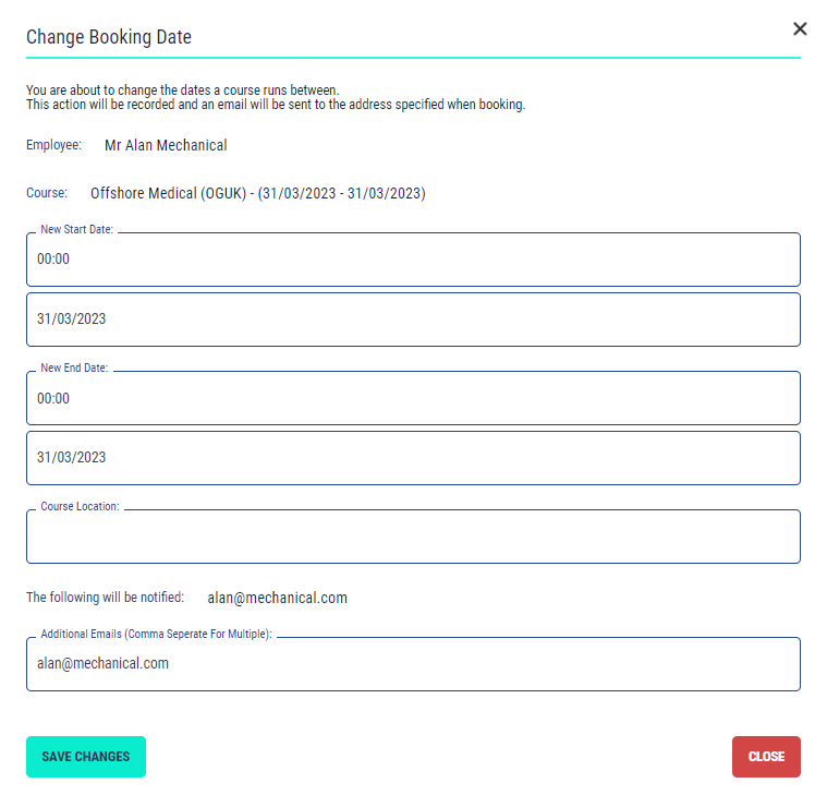 Selecting “Change Date” from the “Actions” button will allow you to change the date and time set against the booking.