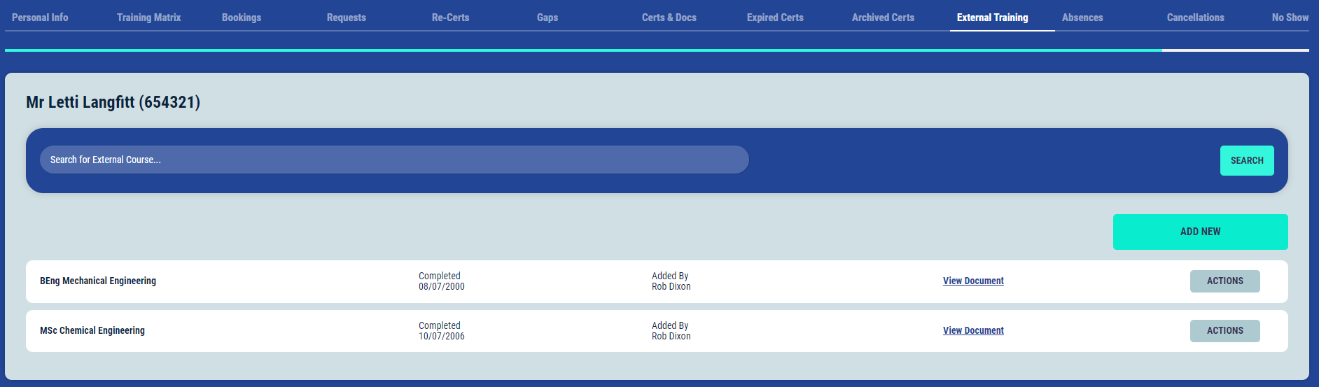 The External Training tab allows you to add any supplementary training the employee has that is for reference only – such as Personal development courses, here you can add new external training using the ‘Add New’ button.