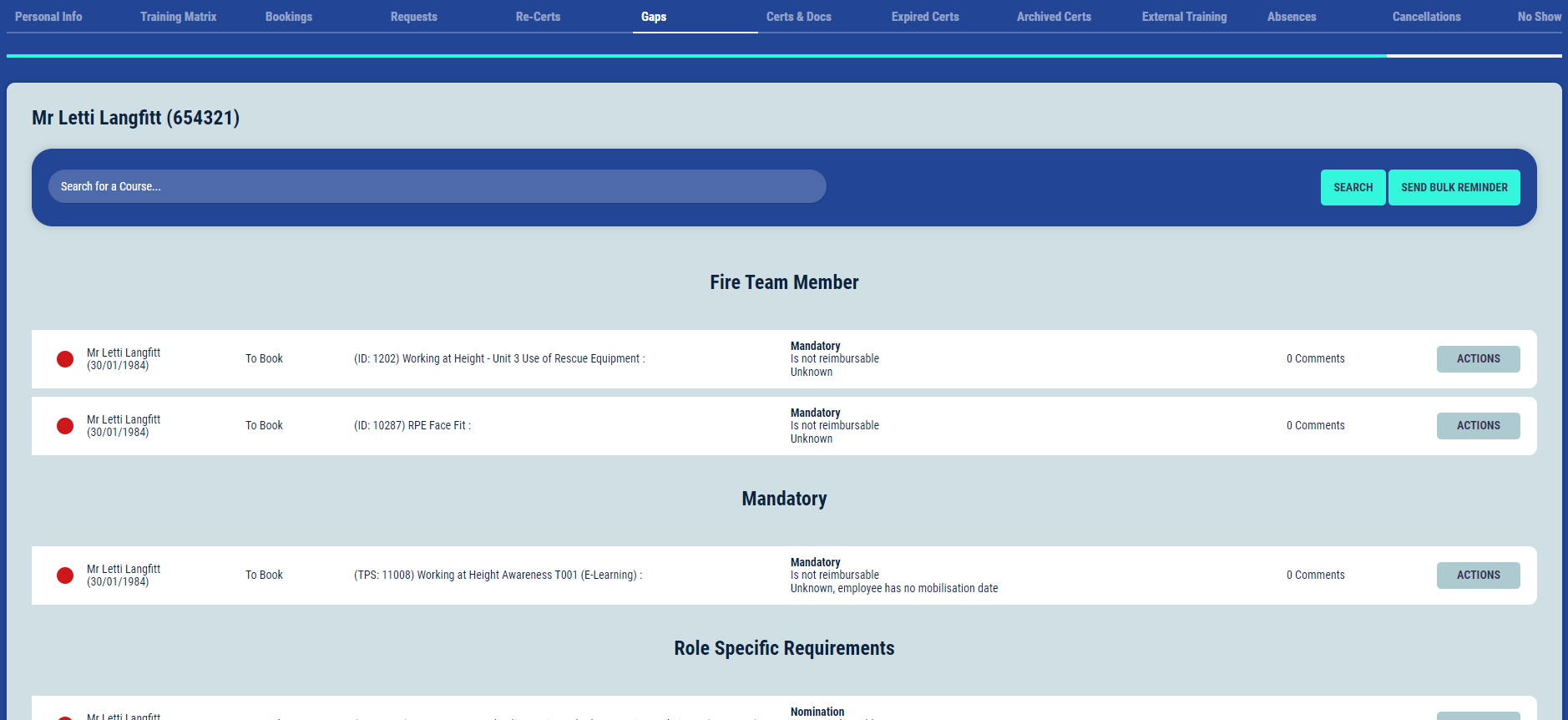 From here you will be able to search for any courses that is outstanding and you will be able to select the “Send Bulk Reminder” which will send the delegate and automated notification listing the outstanding courses