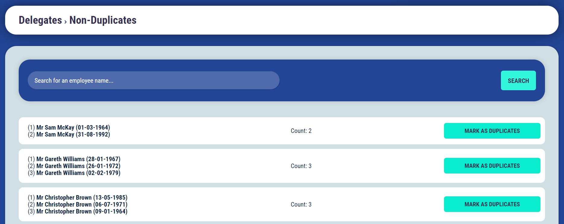 If you have marked the delegate as Non-Duplicate in error you can reverse this action by marking them as duplicates. Their profile will now appear back in the Duplicate Employees section to be merged.