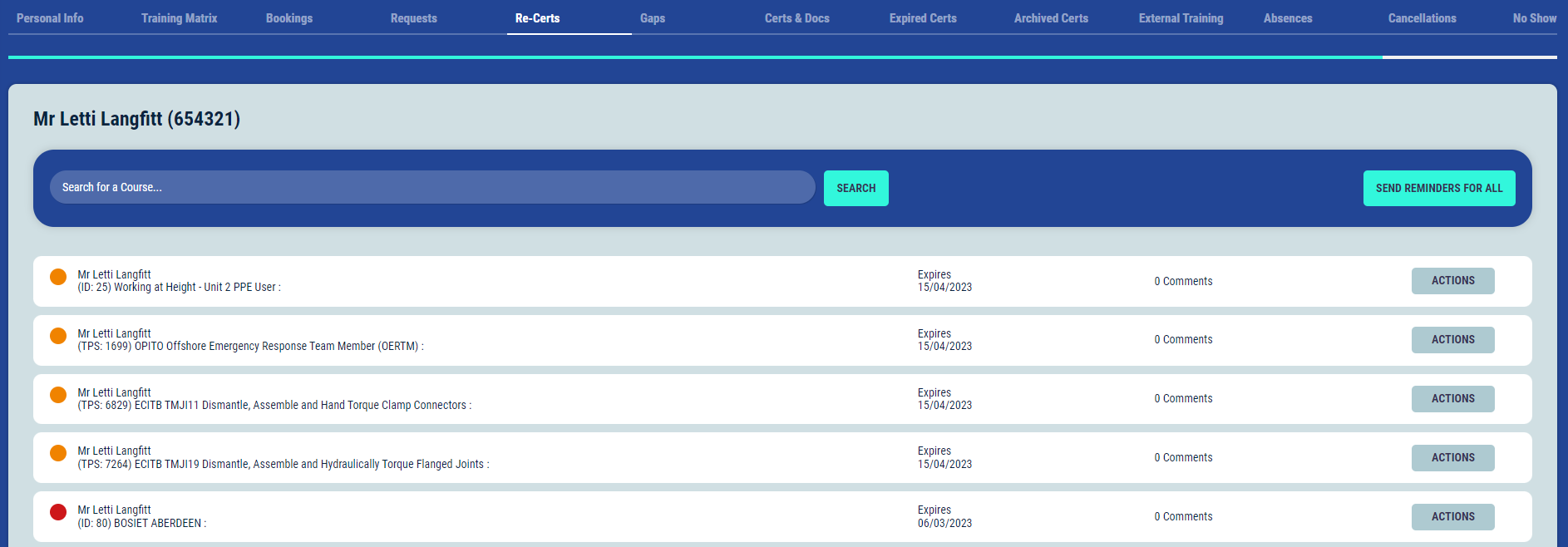 From here you will be able to use the search bar to search the list of certificates showing, and also be able to click the “Send Reminders for All” button which will send the delegate an automated notification listing the courses that are due to expire.