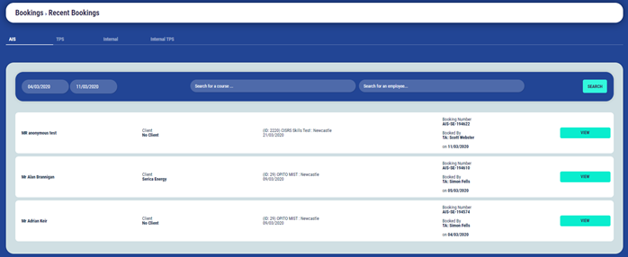 The Recent Bookings View displays all bookings made in the past 7 days. You can select AIS, TPS, or Internal courses and further filter by date, course, or employee. Simply input the necessary details in the fields provided and click the ‘Search’ button to proceed.
