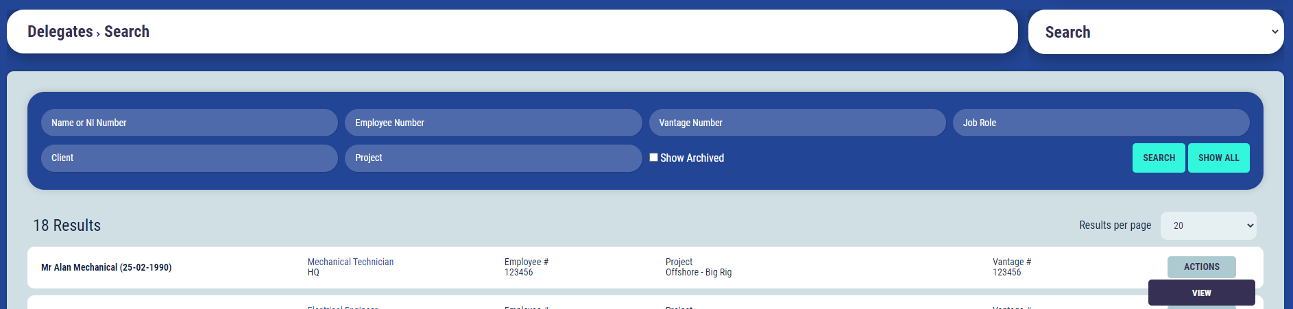 Selecting ‘Delegates’ from the menu pane and then “Search” will allow you to search for delegate accounts that is within the Training Management System.