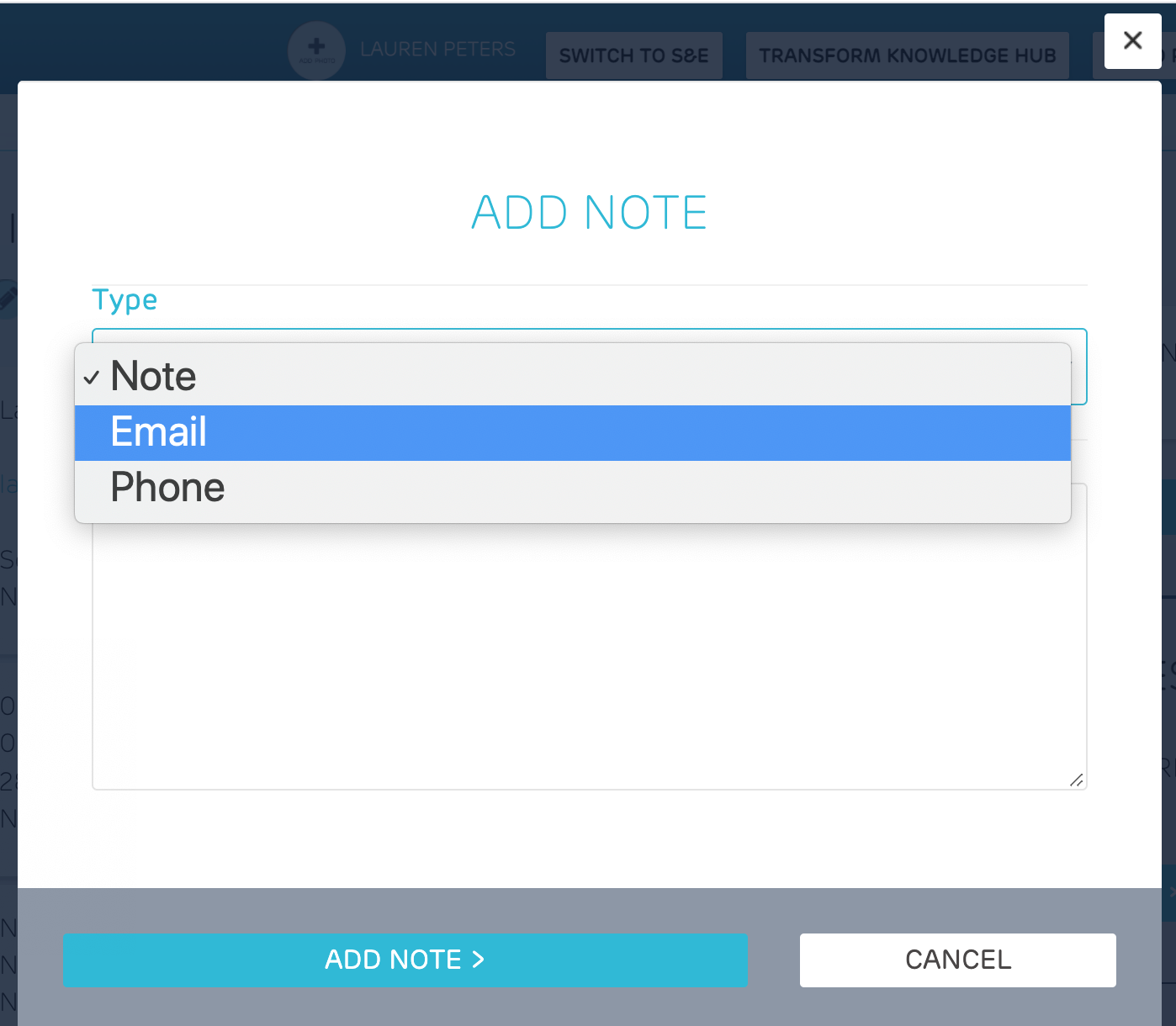 You can now add the type of note or communication type within the notes section of a delegates account. Selected ‘Add Note’ will bring up the new note screen, an additional drop down will appear so you can select ‘Email’ or ‘Phone' if they have been contacted. | |