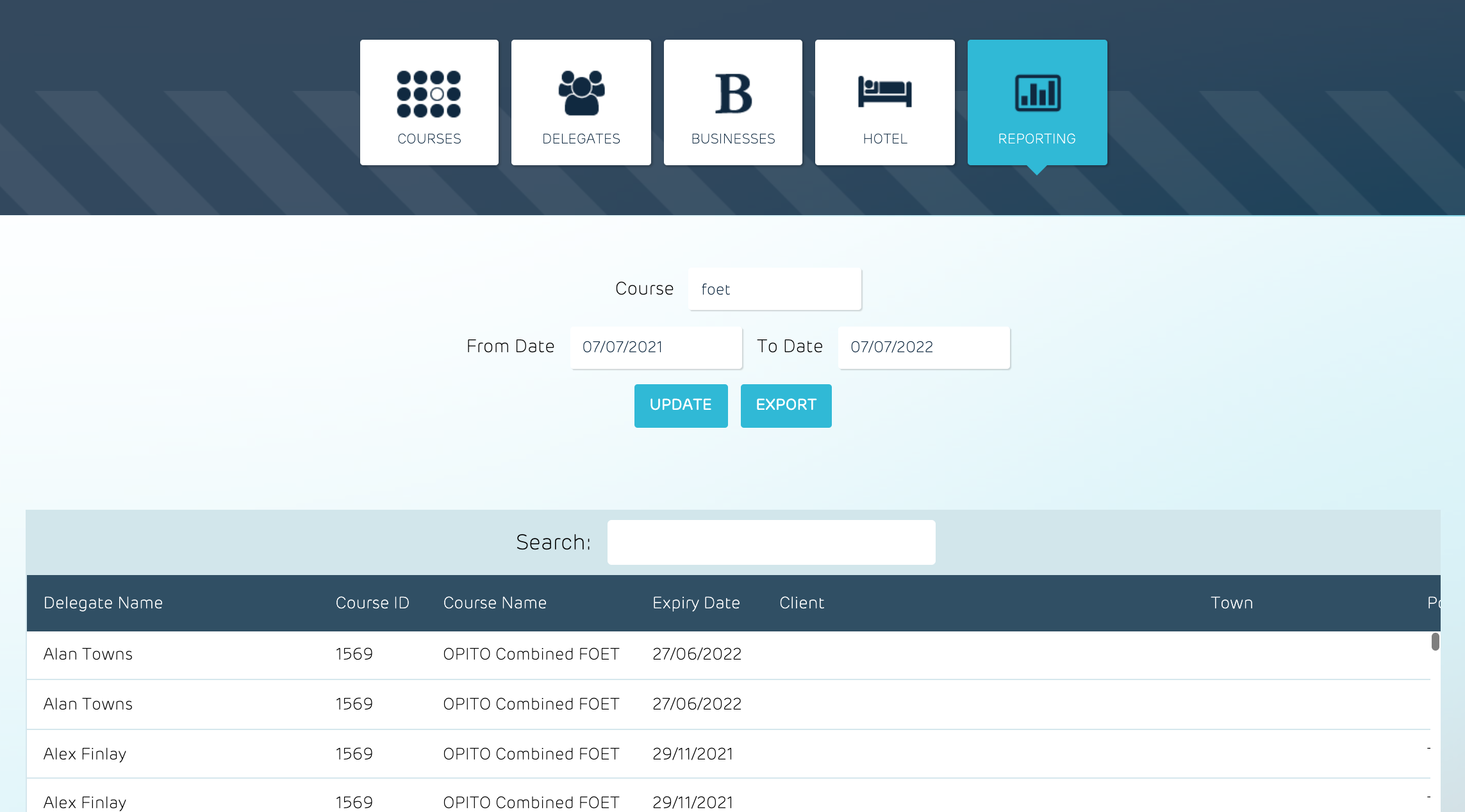 To access the report, select the ‘Report’ tab and select the ‘Gaps Look Ahead’ report at the bottom of the list. You will be able to filter by to & from dates and the course title. Once the results have been filtered you can use the search box to search for a specific name, client, town or postcode to further narrow down your results. |