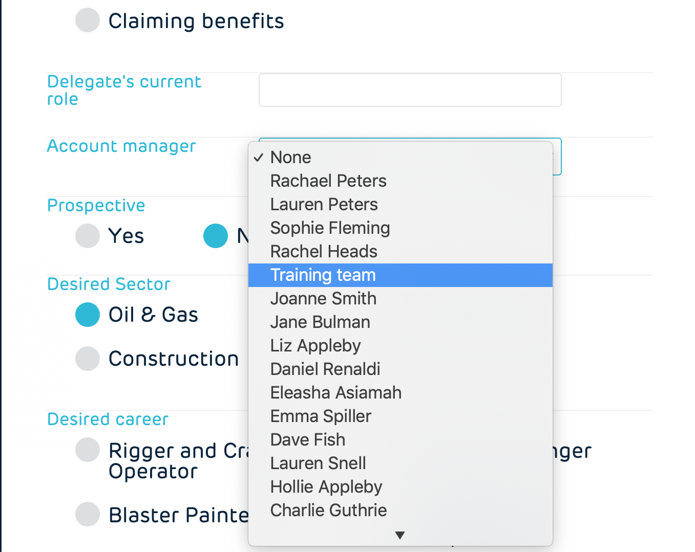 Delegate accounts can now have Account Managers assigned to them. By accessing the delegate account and editing their information, a new drop down should appear you can select a member of staff who is responsbile for that delegate’s account & bookings. | |