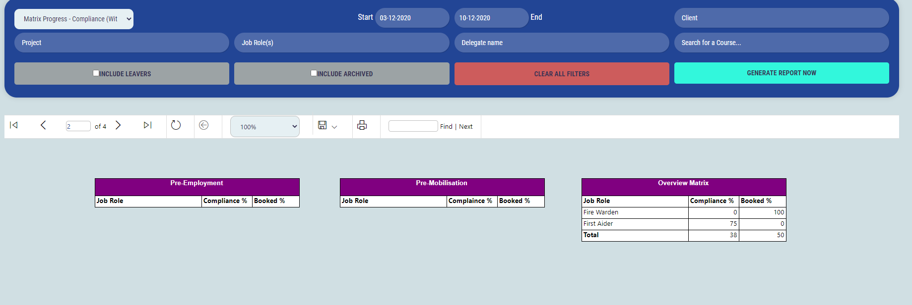 The ‘Matrix Progress Compliance (with overview)’ report now includes a breakdown of each stage and job role. This screen now showed the pre-employment, pre-mobilisation & matrix overview percentages for compliance and bookings. |