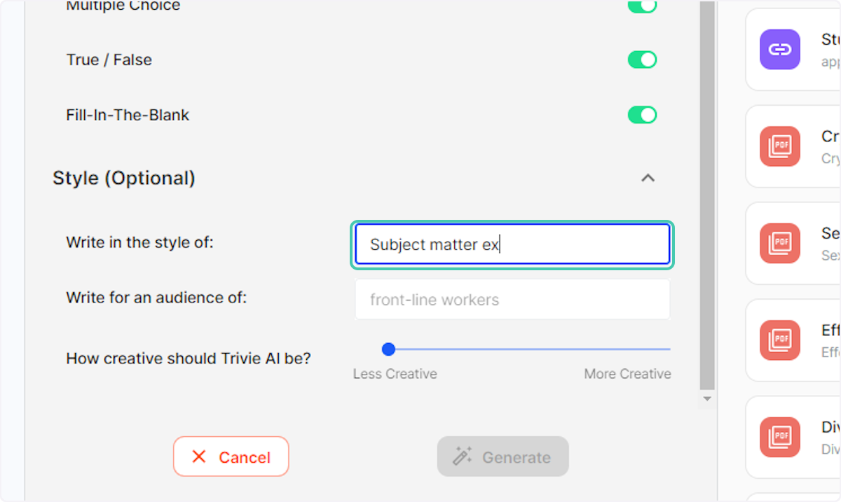 6. Type the style you want the AI to generate the quiz in i.e "Subject matter expert"
