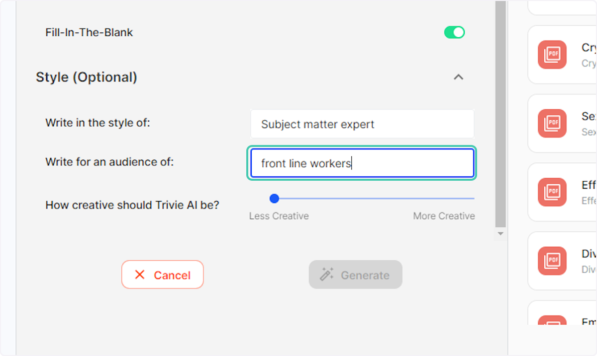 8. Select how creative the Trivi AI is to be